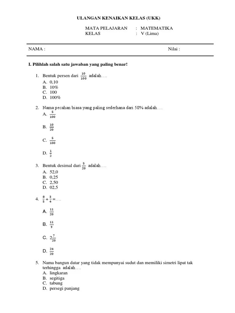 Download soal pat/ukk matematika kelas 5 sd/mi pilihan ganda + essay dan kunci jawaban semester 2 (genap) kurikulum 2013 (k13) tahun ajaran . Soal ukk matematika kelas 5 semester 2 edit. Soal pat matematika kelas 5 k13 dan kunci jawaban, download soal ukk matematika kelas v sd/mi kurikulum 2013 terbaru tahun 2021. Soal ukk matematika kelas 5 semester 2 a · author / uploaded · frans kelvin. Soal pat atau ukk matematika kelas 5 kurikulum 2013 bisa diunduh secara gratis di halaman ini.